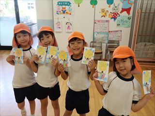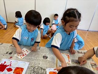 年少さんは、指スタンプを落ち葉に見立て、滲み絵で木を製作しました。最後に可愛いどんぐりを貼り、秋らしいハガキが出来上がりました。