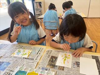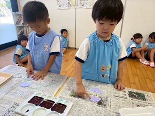 年中さんは、絵の具で吹き絵をし、ブドウの中から出てきているようなかわいらしいハガキができました。