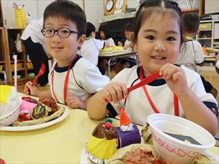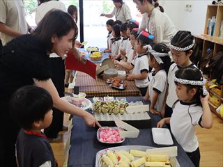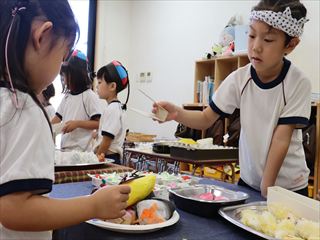 子ども達が、一番楽しみにしていたデザートには、アイスにかき氷、ももまんにプリン、ケーキにドーナツ、そしてゆりかご教室に通ってくれた未就園児の子ども達も、三色だんごづくりに参加してくれ、