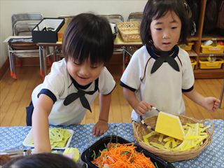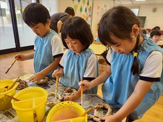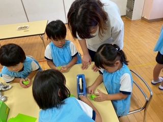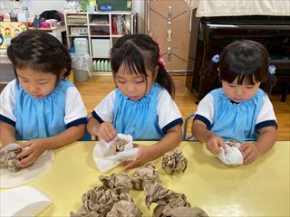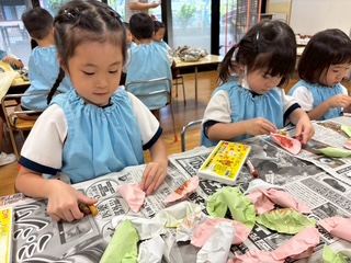 縦割り保育での製作は、年長のお兄さん・お姉さんが、年下のお友だちに優しく接していたり、異年齢ならではの光景が見られ、とても微笑ましかったです。