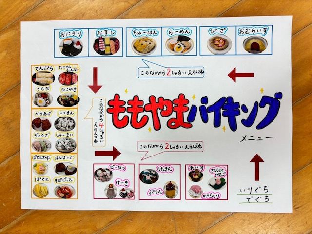 この縦割りクラスで、今年のテーマである、『ももやまバイキング』のメニューを、和食・洋食・中華に分かれて作りました。