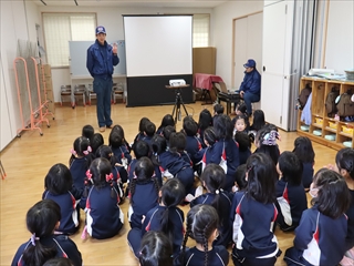 今日は、消防署の方が来られて、避難訓練の様子を指導してもらい、防火について教えていただきました。