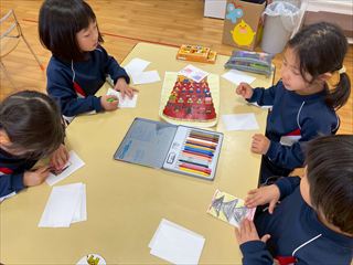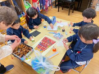 また、一人ひとり違う人形を作り、ひな壇を作りました。3人官女や5人ばやしの表情や持っているものなど、よく観察しながら作り、世界に一つだけのひな壇になりましたね!