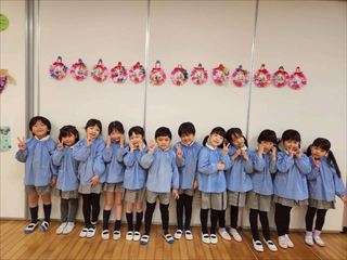 年中さんは、トイレットペーパーの芯を使ってぼんぼりを作り、ぼんぼりから菱餅と女びなと男びなをつるしました。教室に飾ってクルクル回る雛飾りができました!