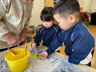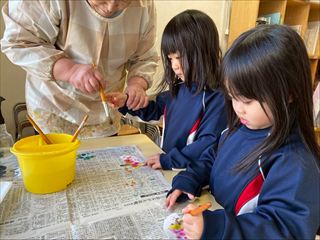年少さんは、めびなおびなの着物を障子紙でにじみ絵をしました。綺麗ににじむ様子に興味津々でした!